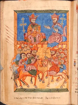 L’art de l’enluminure, pétri des traditions byzantine et occidentale, nourri d’influences orientales, se décline jusqu’au XVIII e siècle dans les différentes écoles des provinces d’Arménie et des communautés de la diaspora. Particulièrement représentée ici, l’école du Vaspourakan, sur les rives du lac de Van, développe un style très vivant tandis que, tardivement, parant d’or et de couleurs les textes copiés depuis toujours, les riches négociants de Constantinople ou d’Ispahan commanditent des manuscrits qui perpétuent les traditions anciennes.